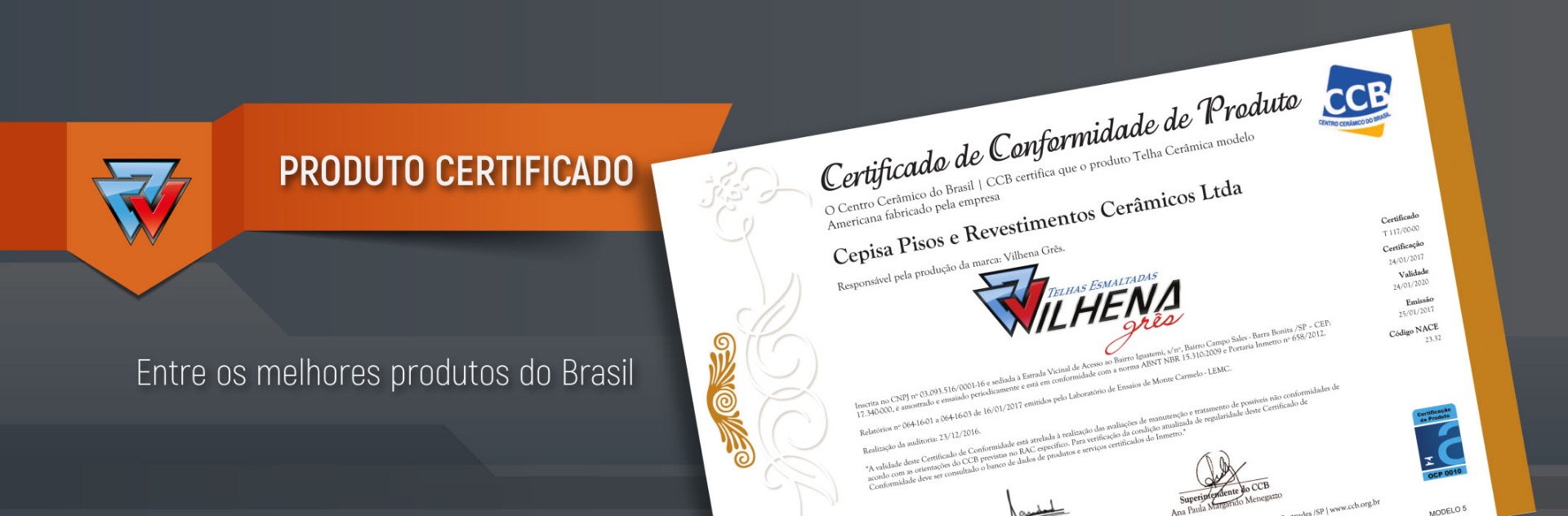Todos os produtos da Vilhena Grês possuem os selos de qualidade INMETRO e CCB (Centro Cerâmico Brasileiro). Os selos INMETRO e CCB atestam a qualidade das telhas esmaltadas produzidas pela Vilhena Grês, colocando-as entre os melhores e mais confiáveis produtos do Brasil.